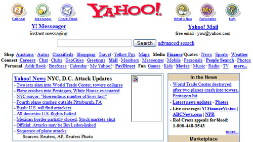 The main real estate of the old Yahoo homepage was dedicated to the attacks: