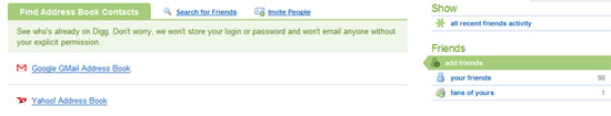 Once in your profile, click the Add Friends link. You’ll be taken to a much improved page that gives you options to see what Digg friends you already have in your Gmai, AOL, and other popular email account. It also shows you who has befriended you, something that was a lengthy process to get to in the past.