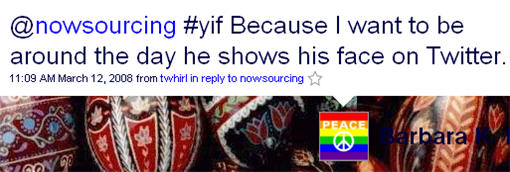 dustinferguson @nowsourcing Their own face! I love to see who I’m interacting with. 09:10 PM March 18, 2008 from web in reply to nowsourcing . . . . . . . . . . . .