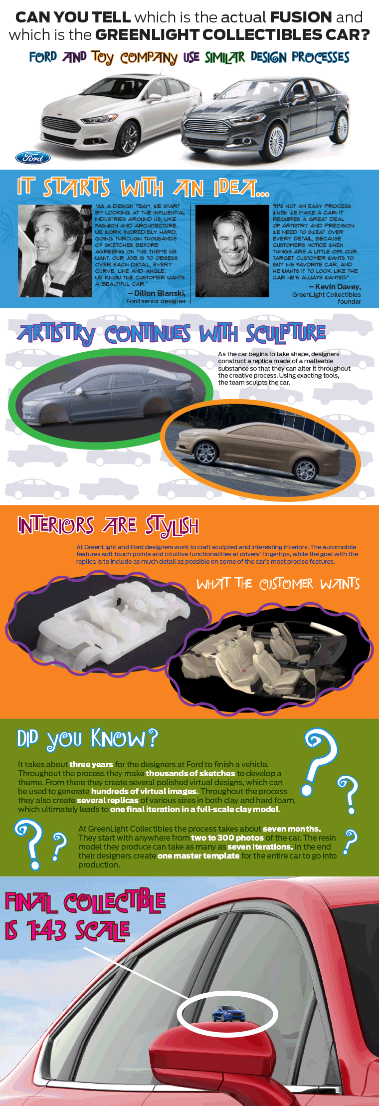 The next infographic we’ll look at compares the actual Ford Fusion and the Greenlight Collectibles car. Can you tell the difference? Toy makers have gotten very good at making toy car replicas look almost identical. This infographic provides a deeper look into how the collectible car is made.