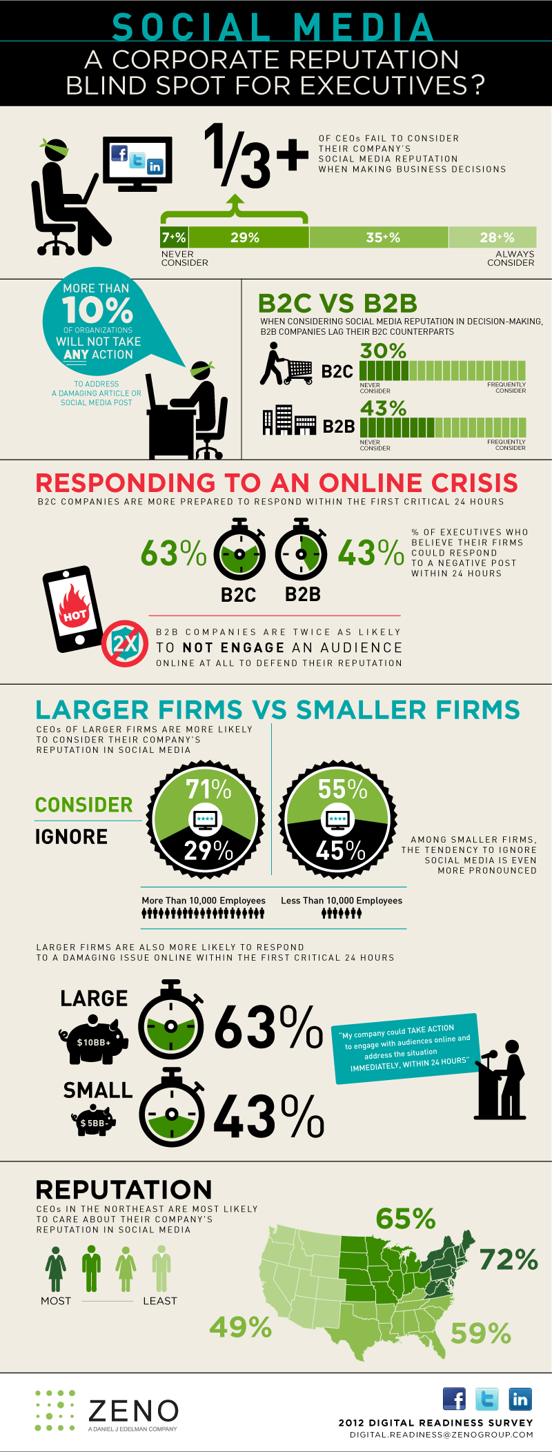 Lastly, did you know that 1/3 of CEOs fail to consider their company’s social media reputation when making business decisions? Social media has become an integral part of most businesses, but there are still some that aren’t taking it seriously. This last infographic highlights how CEOs may not be using social media like they should be.